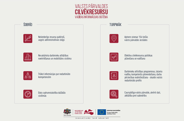 Projekta īstenošanai otrdien, 12. septembrī, saņemts Ministru kabineta atbalsts. Pēc platformas izstrādāšanas tajā tiks īstenota darbinieku atlīdzības vadība un analīze, darba rezultātu novērtējumu un talantu vadība, augstākā līmeņa vadītāju atlase un attīstība, vakanču pārvaldība, darbalaika uzskaite un citas cilvēkresursu vadīšanai būtiskas norises.